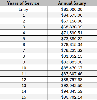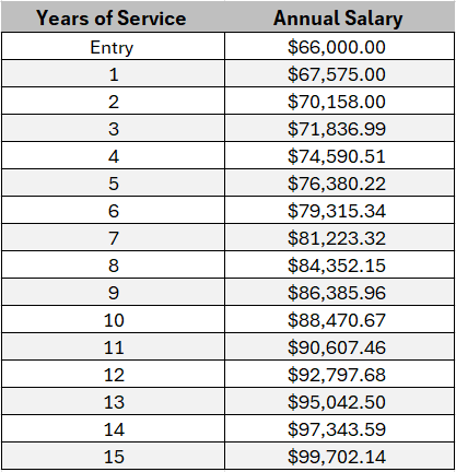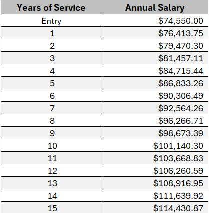 After graduating and being commissioned as a Police Officer, your salary will automatically increase to Step Level 2 on the department's pay scale on the one-year anniversary of your original hire date.